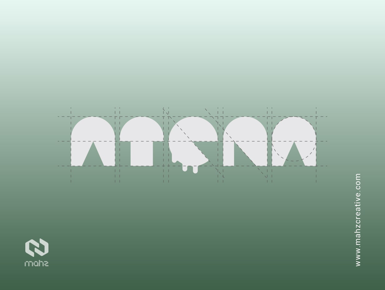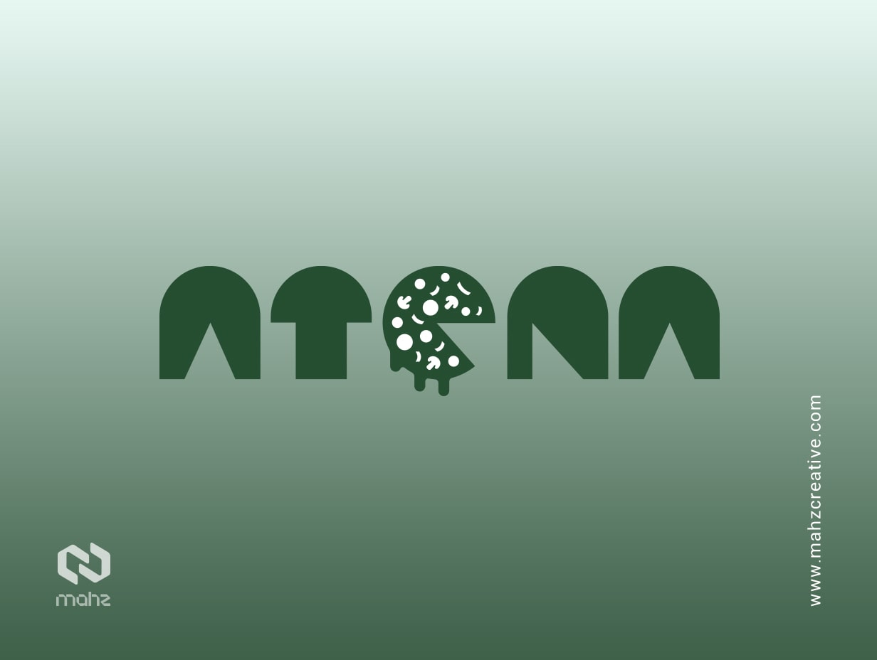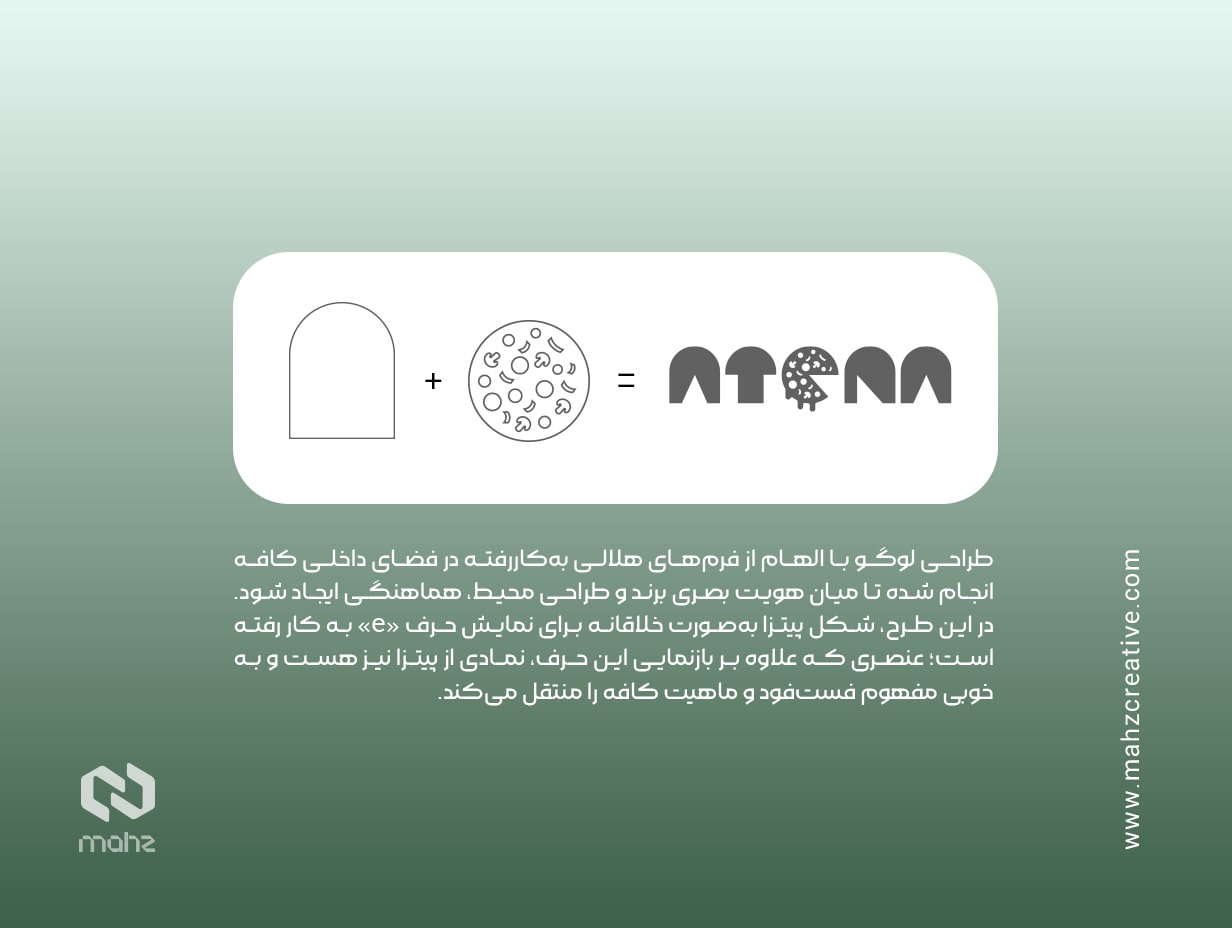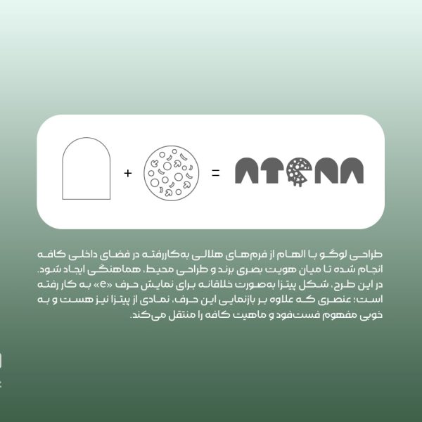 طراحی لوگو با الهام از فرم‌های هلالی معماری داخلی کافه و نماد پیتزا به‌عنوان غذای شاخص منو شکل گرفت. هدف این بود که ارتباطی واضح و درعین‌حال خلاق میان فضا، محصول و تجربه‌ی مشتری ایجاد شود. در ساختار لوگو، حرف «A» با الهام از فرم طاق سنتی طراحی شده و یادآور ورودی آرامش‌بخش فضاهای ایرانی است. در مقابل، حرف «E» با ترکیب برش‌های پیتزا و چیدمان مواد تشکیل‌دهنده‌ی آن به‌صورت گرافیکی بازآفرینی شده تا حس طراوت و اشتها را القا کند.