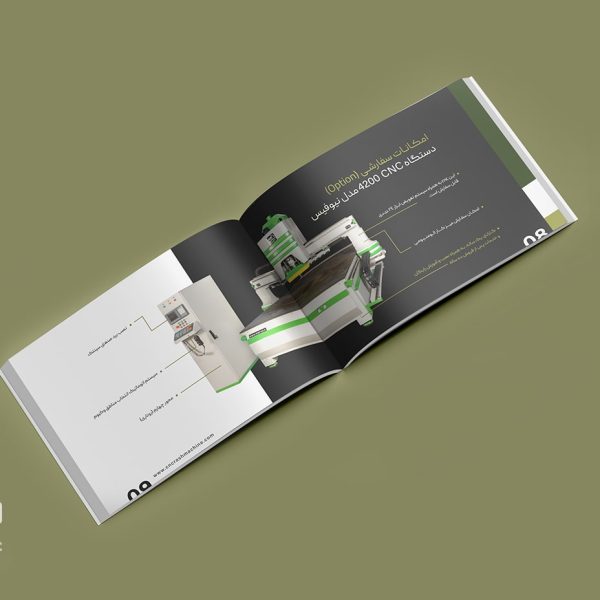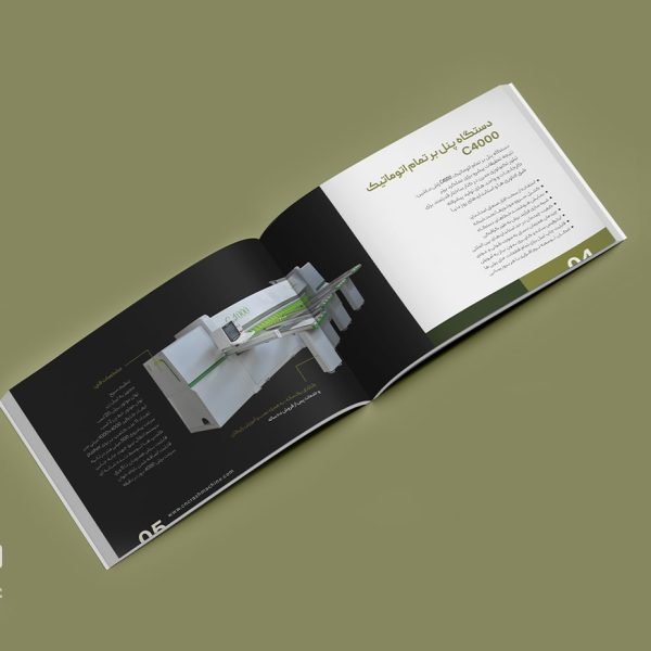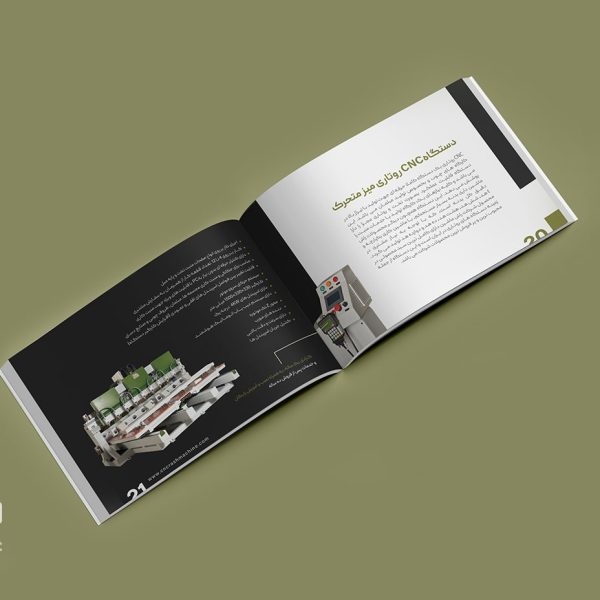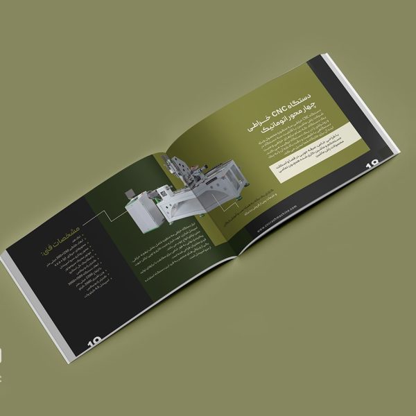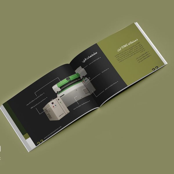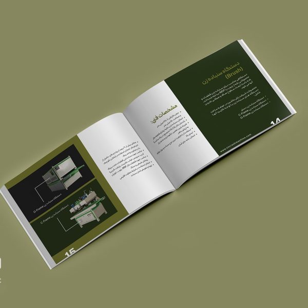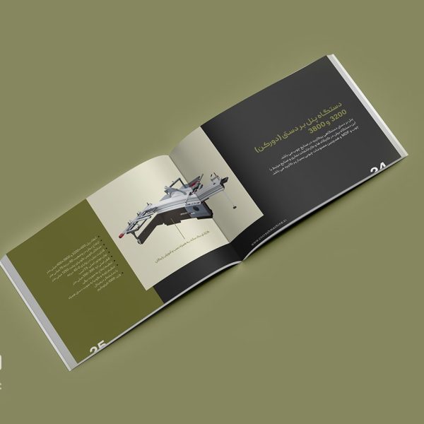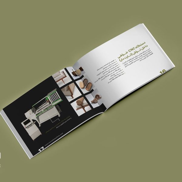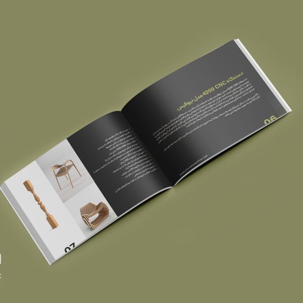 جلد کاتالوگ با استفاده از تصویر یکی از دستگاههای کلیدی برش چوب و رنگبندی هماهنگ با صفحات داخلی طراحی شد. این جلد بهگونهای ساخته شد که هم در ویترین نمایشگاهها توجه جلب کند و هم در نسخه دیجیتال جذاب و صنعتی به نظر برسد.